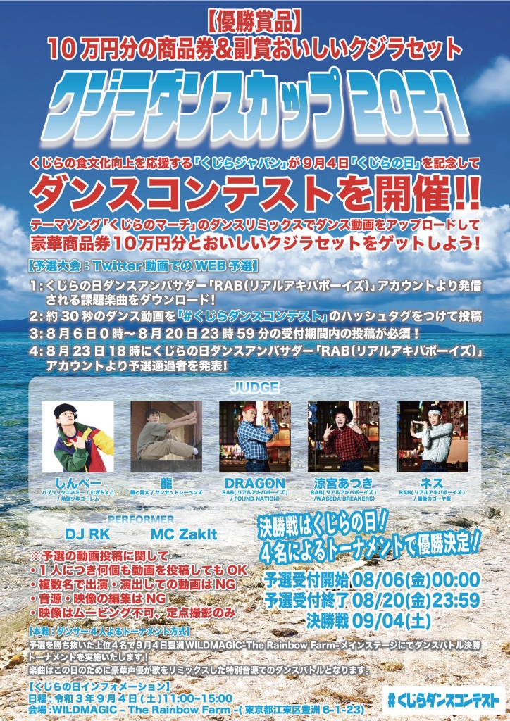 【優勝商品10万円分超え!】くじらダンスアンバサダー『RAB(リアルアキバボーイズ)』就任!くじらの日記念 くじらダンスコンテスト 開催決定!参加費用無料!!8月6日より開催されるWeb予選にTwitterへの動画&ハッシュタグをつけて投稿で参加完了! 【... -